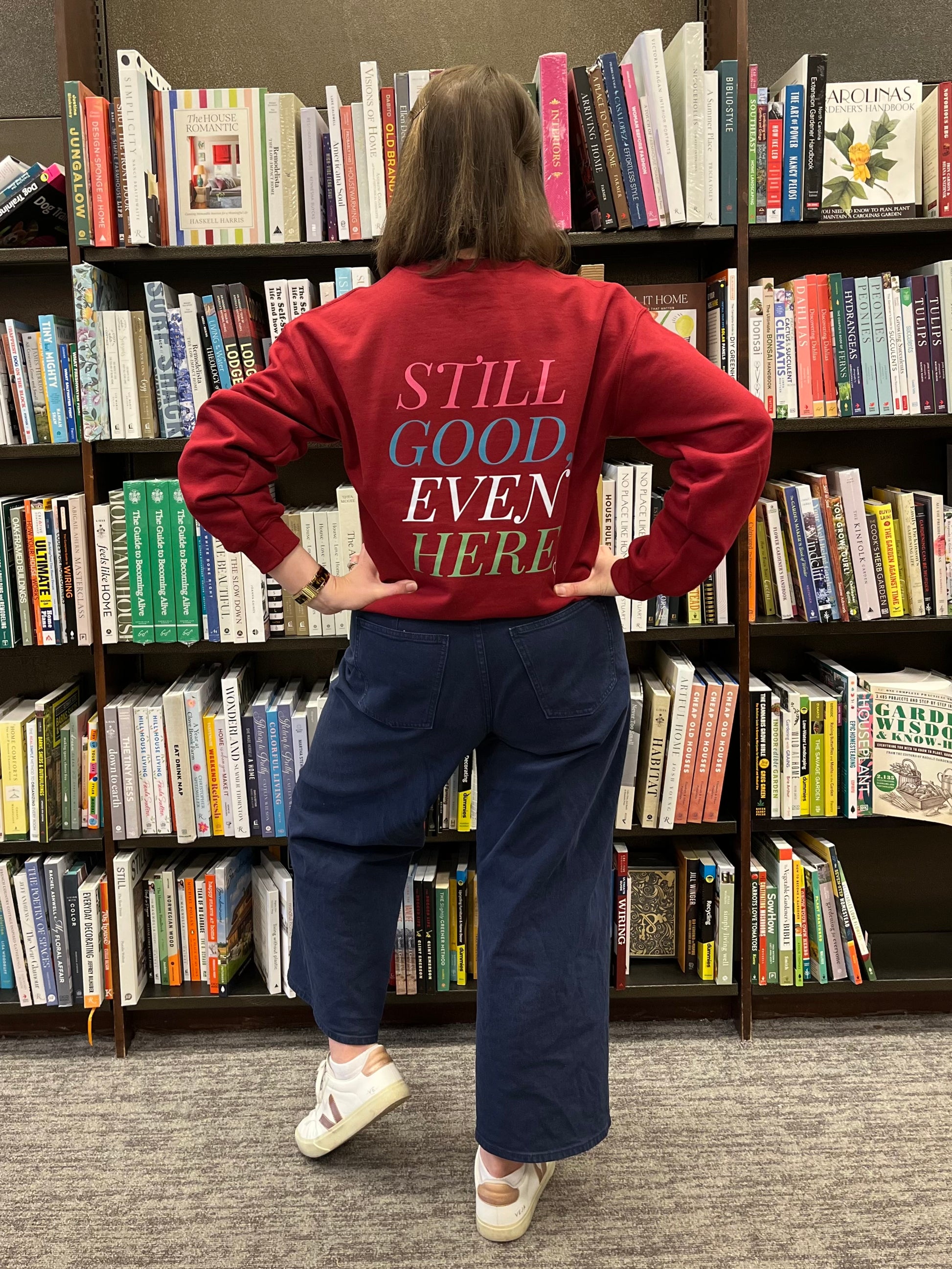 The back detail reads "Still Good, Even Here" to remind women everywhere that our value will never change. We believe that it is possible to live a beautiful life, even here.